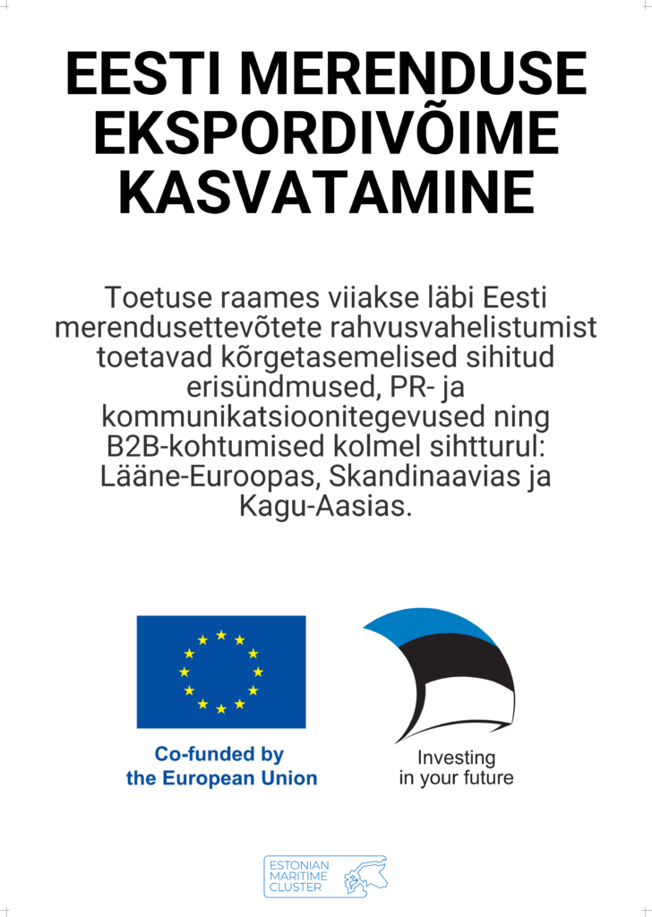 Estonian Maritime Cluster (EMC) is a dynamic and innovative network of maritime industry professionals, companies, and organisations working together to promote the growth and innovation of Estonia’s maritime sector.